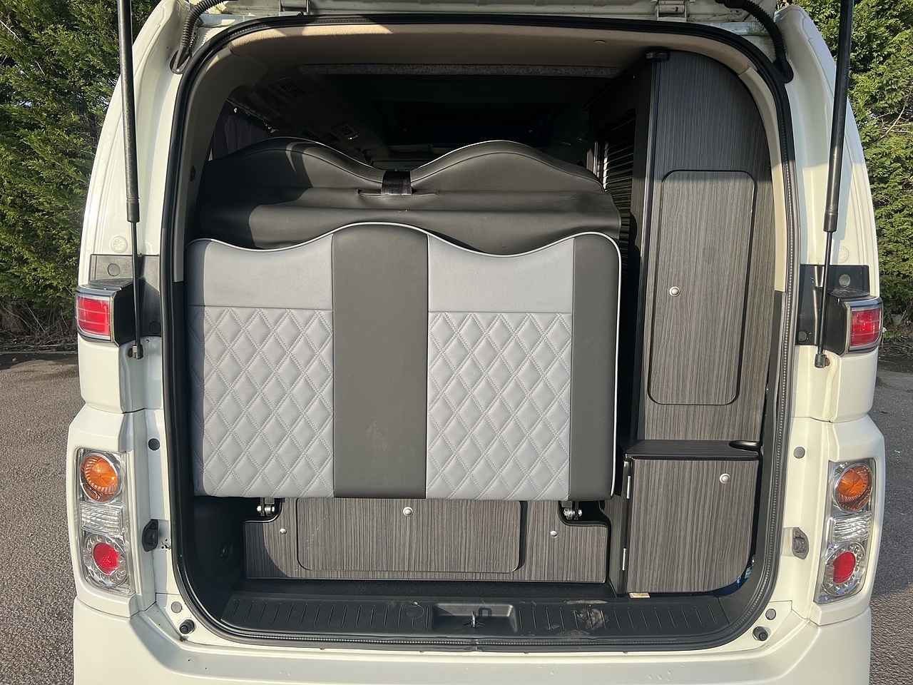 Dressed in an immaculate White finish, the Nissan Elgrand exudes sophistication and style, ensuring you make a statement wherever you go. It's fully equipped camper includes a gas hob, sink, fridge and plenty of storage space. The back seats fold out into a double bed, whilst the pop up ceiling offers more sleeping room. This vehicle offers unparalleled comfort and elegance for both driver and passengers.